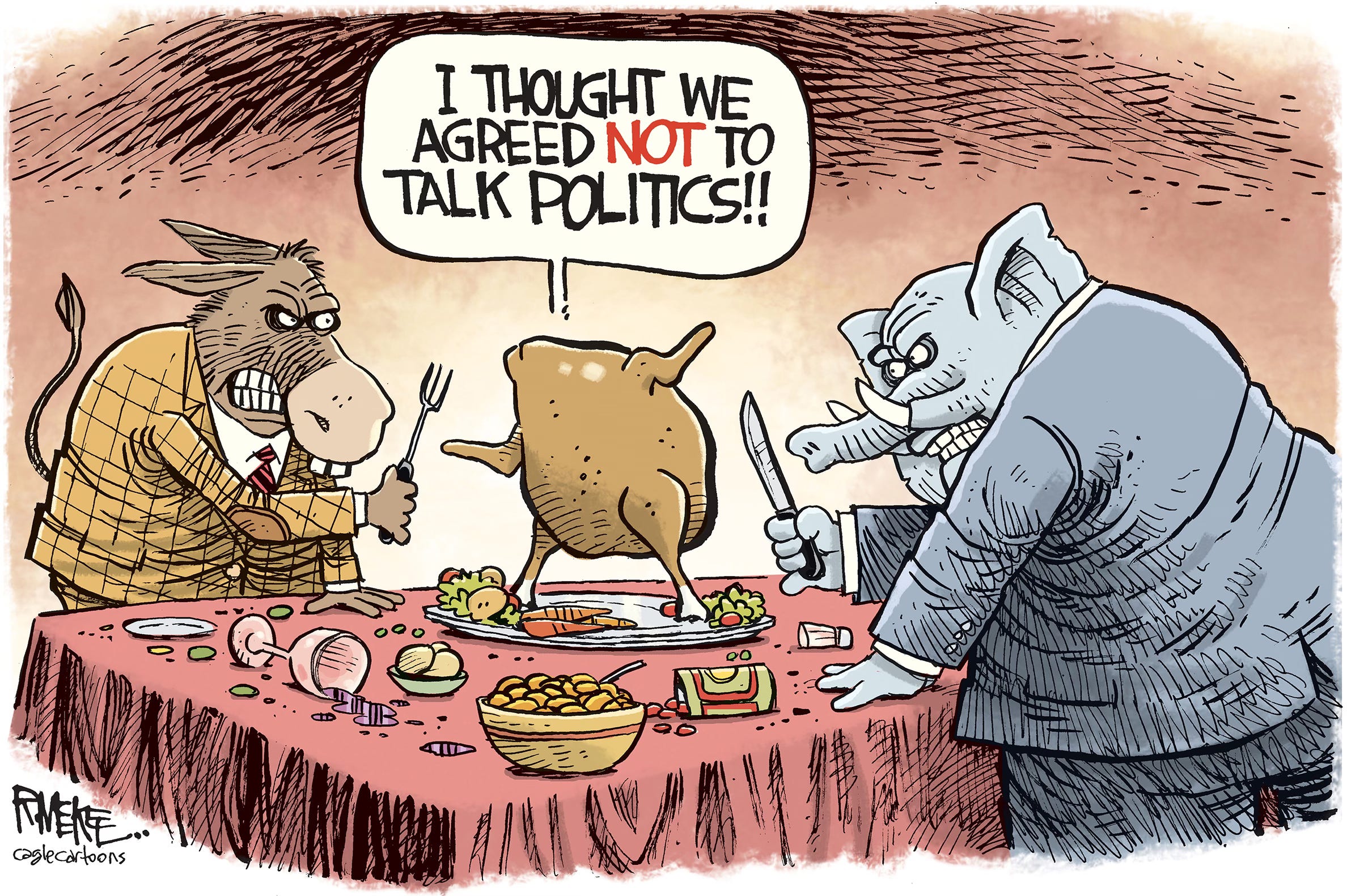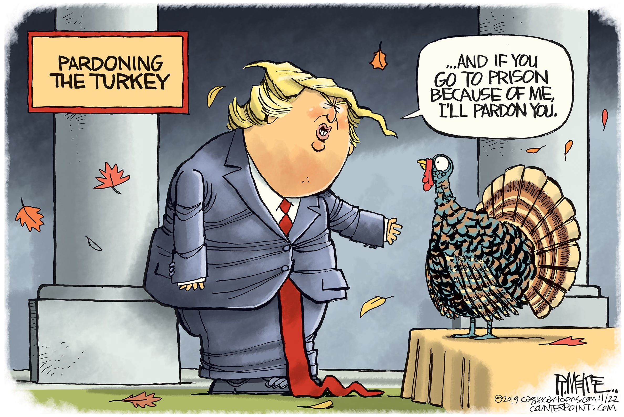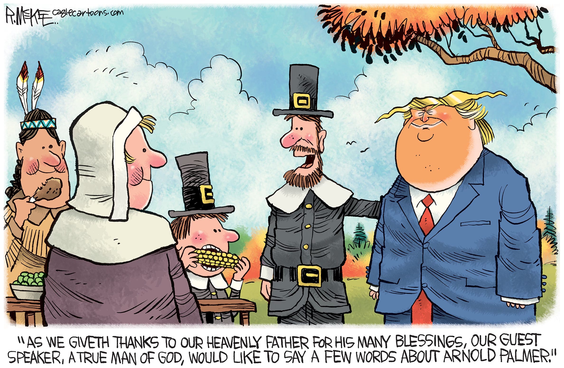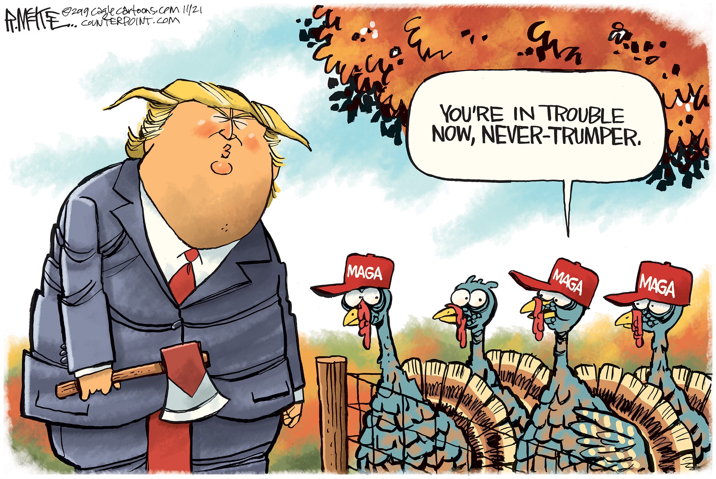 Cartoonists love holidays because of the traditions, imagery and metaphor possibilities. And Thanksgiving is no exception with pilgrims, turkeys and old guys with axes. The trick is to try to come up with a fresh, new spin on a worn out concept. Feast your eyes on 13 cartoons from both Trump presidencies, starting with one going back as far as right after the first election in 2016. (You can see I was still struggling with how to caricature him.) Who’s hungry for more Trump?