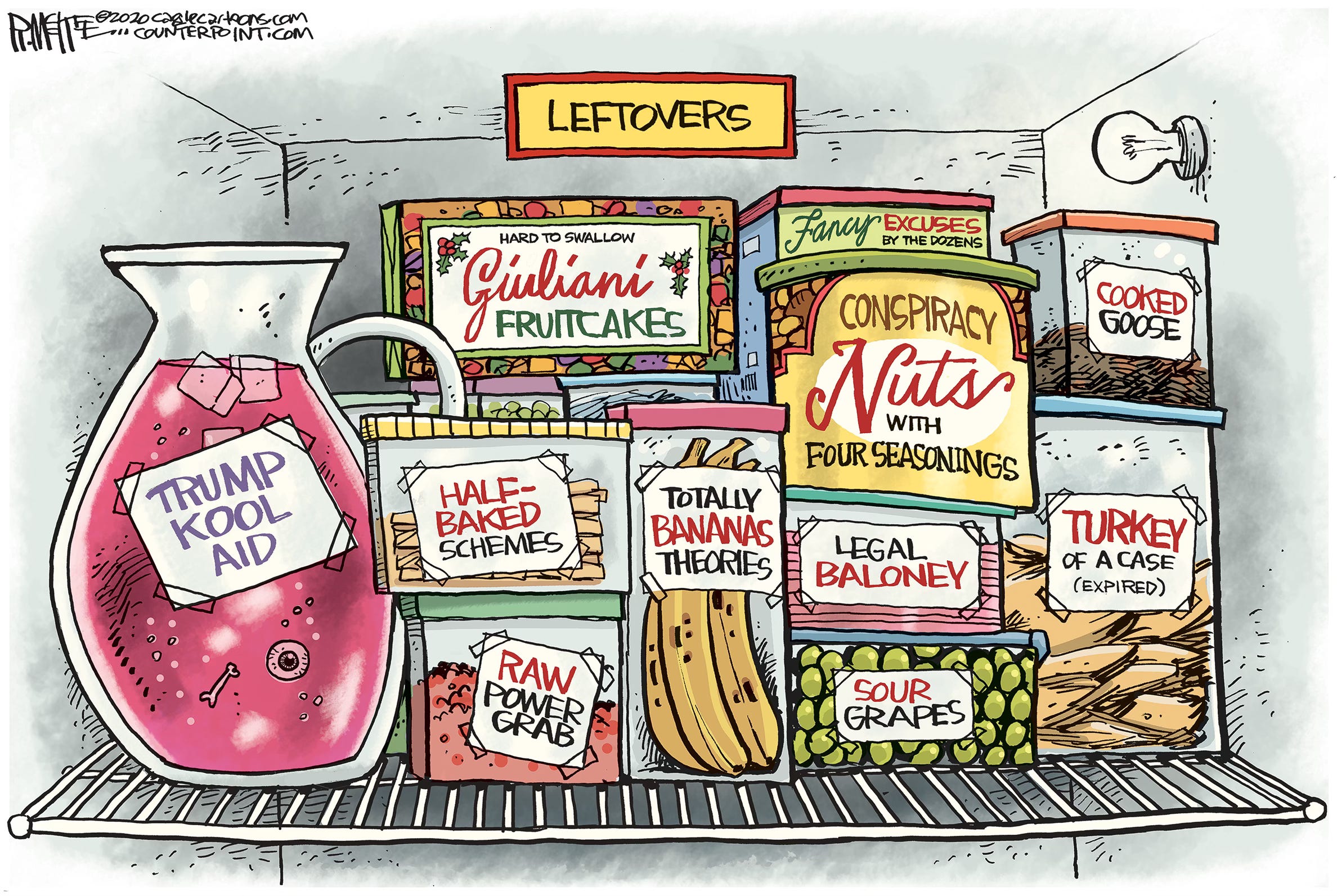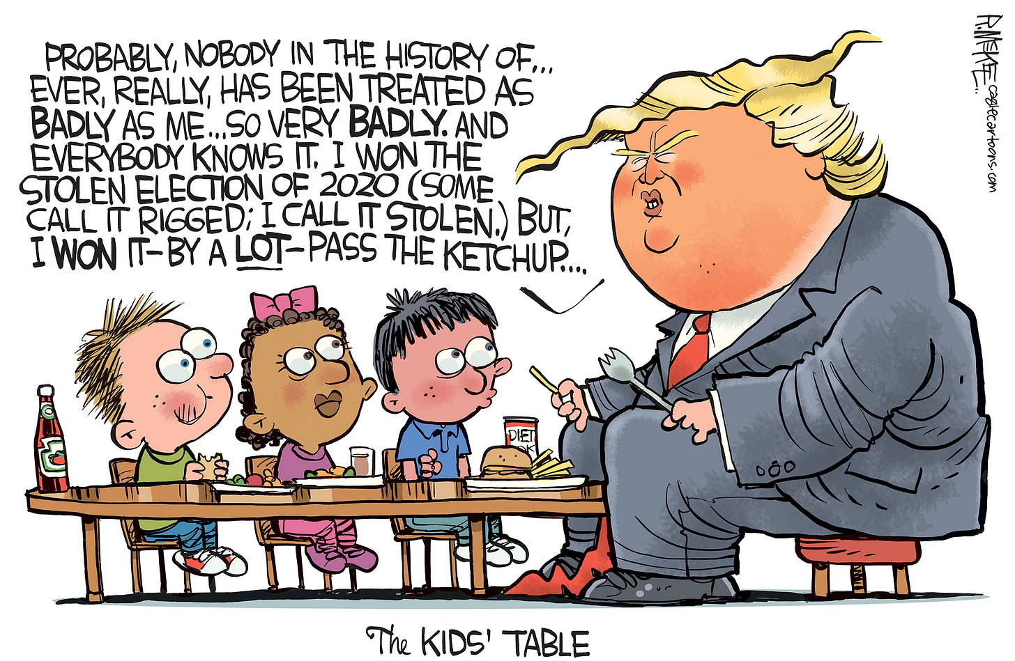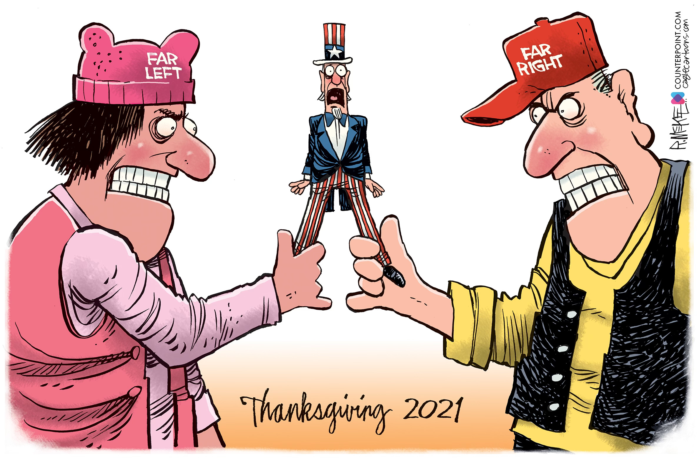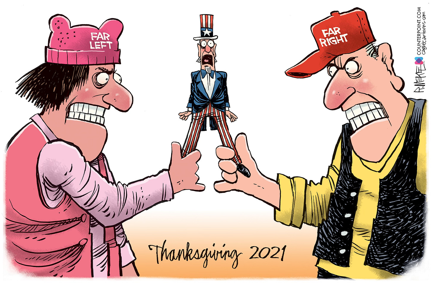 Cartoonists love holidays because of the traditions, imagery and metaphor possibilities. And Thanksgiving is no exception with pilgrims, turkeys and old guys with axes. The trick is to try to come up with a fresh, new spin on a worn out concept. Feast your eyes on 13 cartoons from both Trump presidencies, starting with one going back as far as right after the first election in 2016. (You can see I was still struggling with how to caricature him.) Who’s hungry for more Trump?