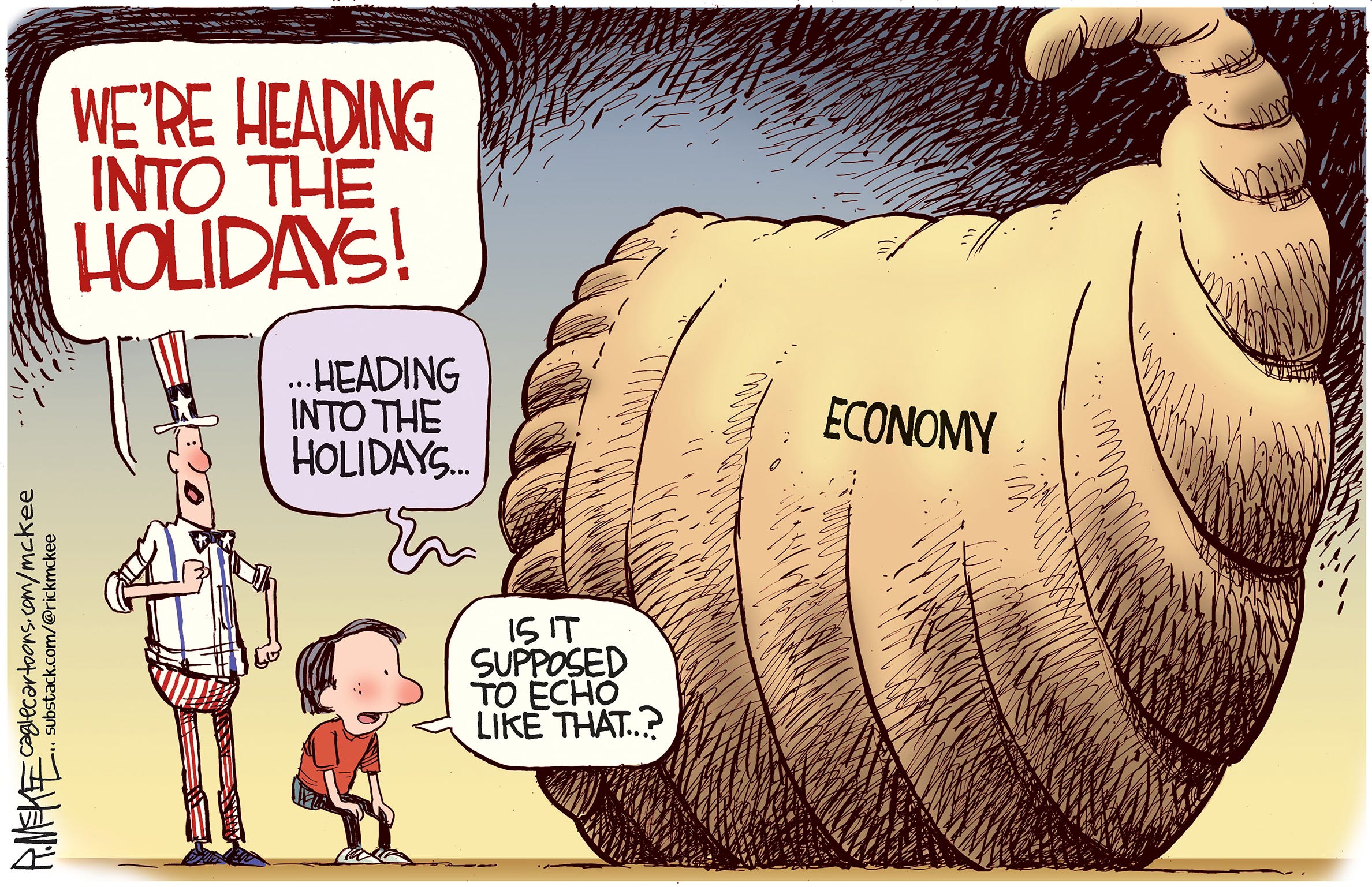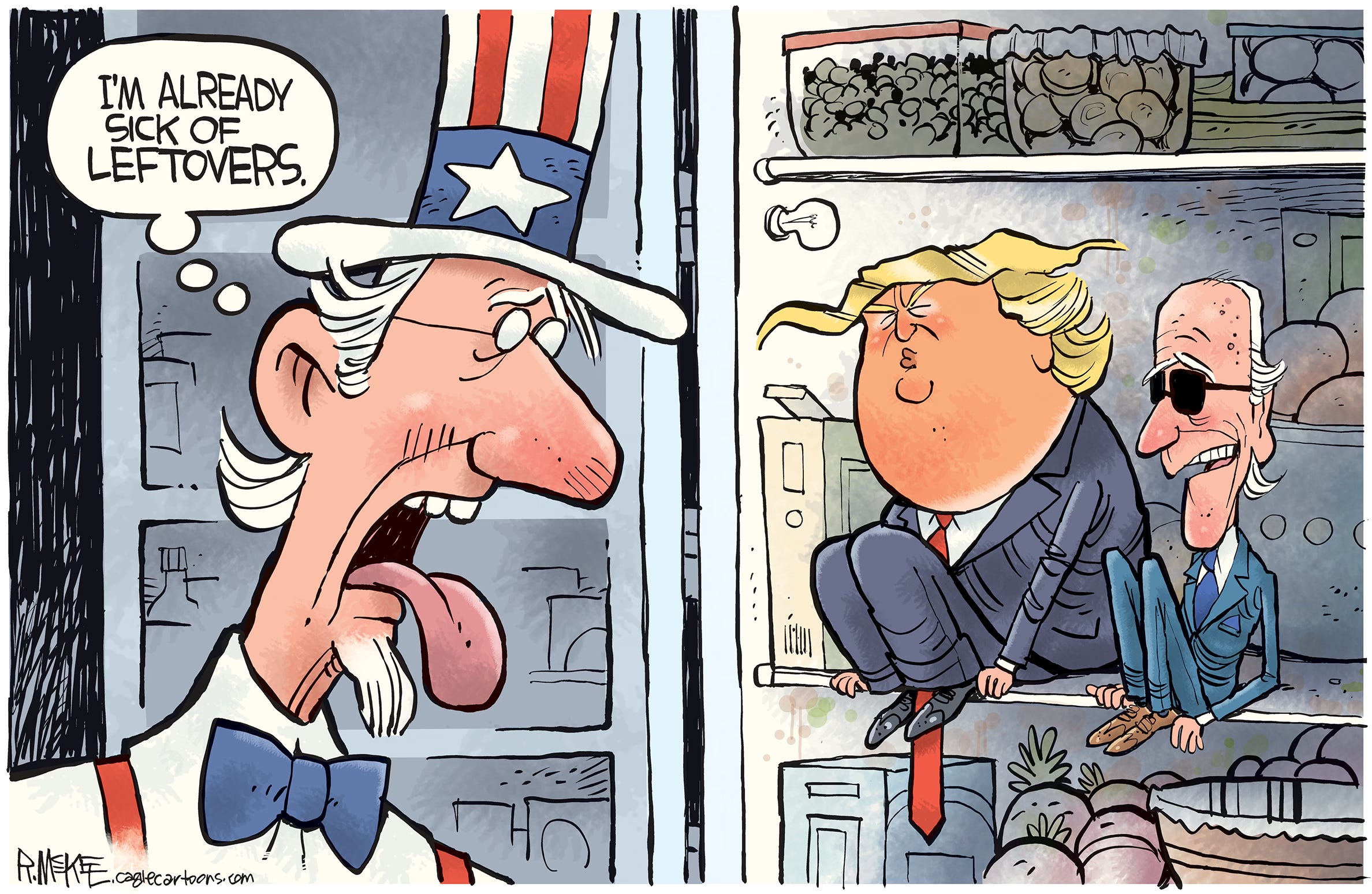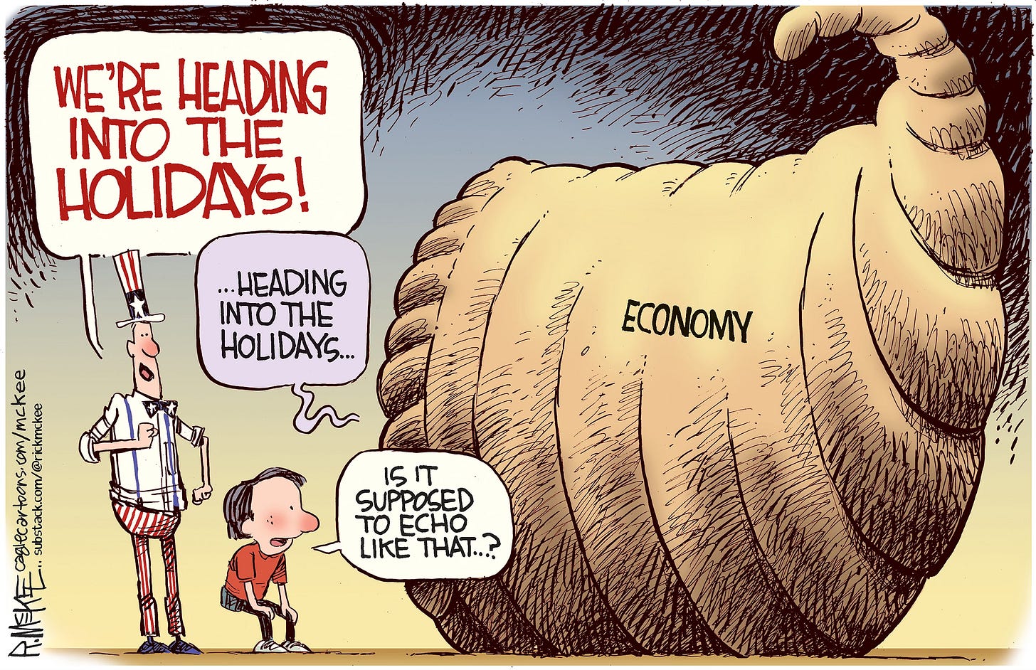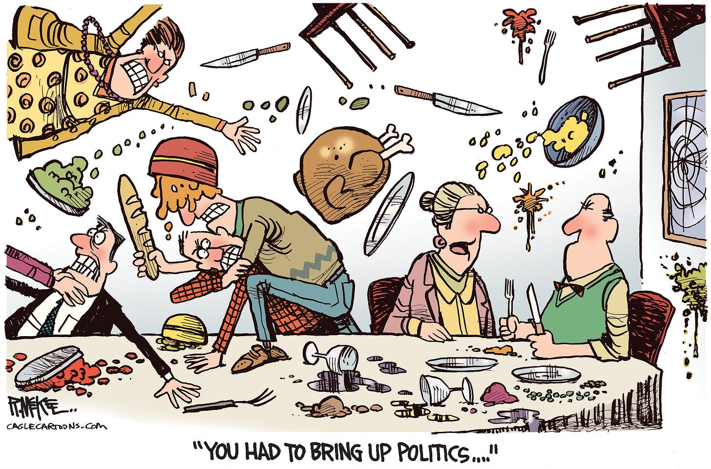 Cartoonists love holidays because of the traditions, imagery and metaphor possibilities. And Thanksgiving is no exception with pilgrims, turkeys and old guys with axes. The trick is to try to come up with a fresh, new spin on a worn out concept. Feast your eyes on 13 cartoons from both Trump presidencies, starting with one going back as far as right after the first election in 2016. (You can see I was still struggling with how to caricature him.) Who’s hungry for more Trump?