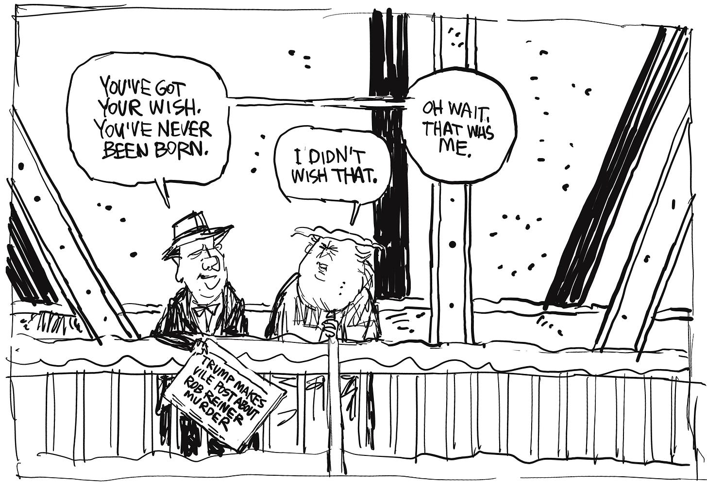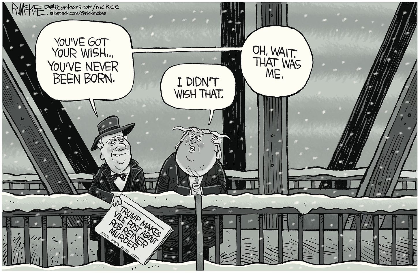 Trump’s comments about the vicious murder of beloved actor and director Rob Reiner were so reprehensible, even his usually-dependable, knee-jerk defenders were appalled. This man is depraved, totally devoid of any empathy whatsoever. It’s enough to push Clarence the angel over the edge.