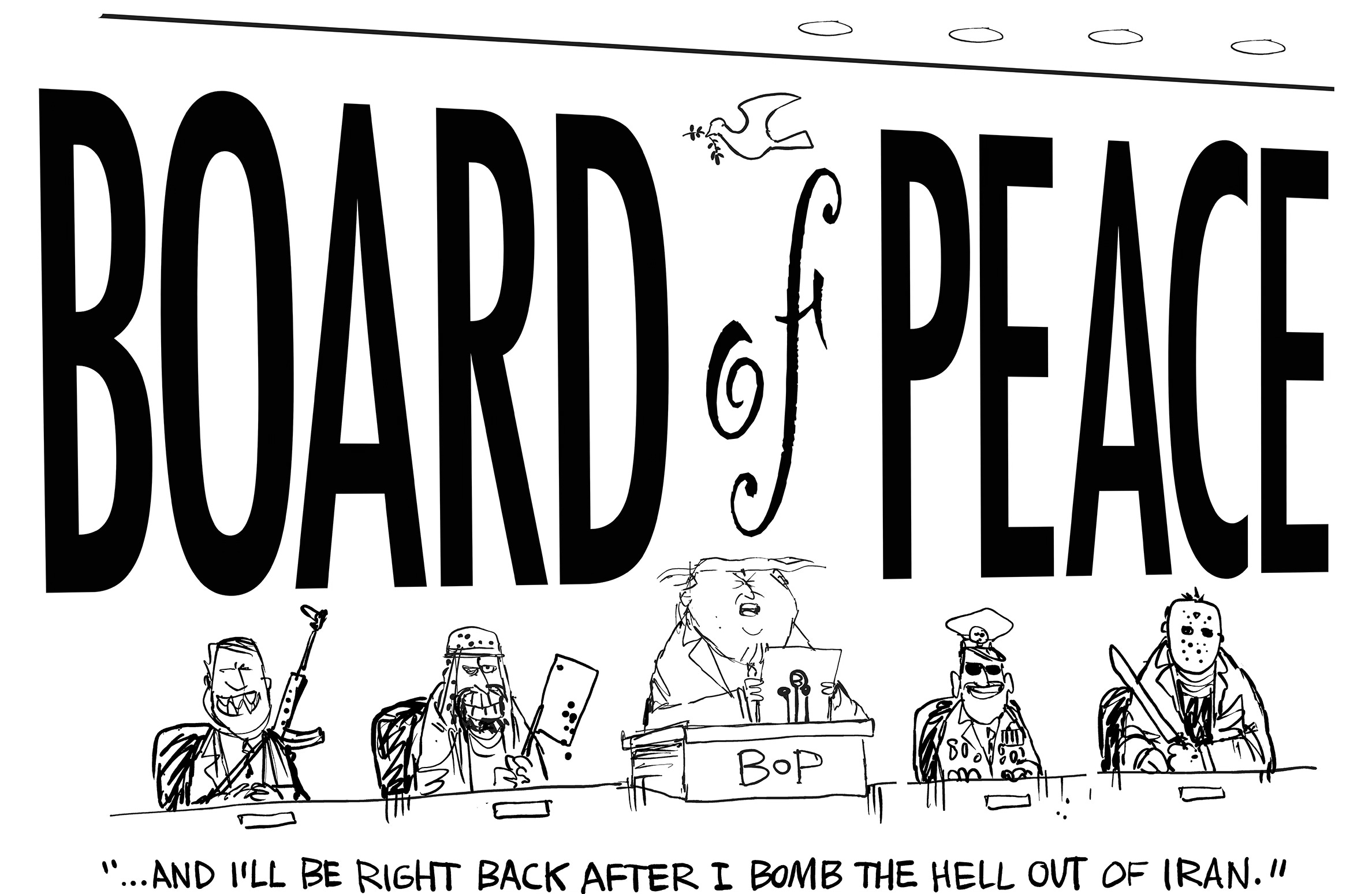 There’s an anti-hero character in the D.C. universe who goes by Peacemaker, who’s especially good with pretty much all weapons and his motto is, “I cherish peace with all my heart. I don’t care how many men, women, and children I need to kill to get it.” I think you can guess who he reminds me of. Trump lusts after the Nobel Peace Prize so badly, — despite his comical denials — that he’s created a “Board of Peace,” with the price of admission only $1 billion. He’s invited the likes of war criminal and anti-Christ candidate, Vladimir Putin, as well as the Saudi Arabian government and authoritarians like Orbán of Hungary and Erdoğan of Turkey. Most of the countries represented are repressive with records of human rights abuses. It sounds like a bad Dr. Evil scene from an Austin Powers movie. Supposedly, the Board of Peace was formed to oversee the reconstruction of Gaza and maintain the ceasefire. You know, peace. However, ironically, Trump is itching to launch an attack on Iran and we’ve built up a huge military presence nearby. I’m not sure what board is supposed to mediate the peace if he decides to attack Iran or how that fits into his oft-stated policy of “no more foreign wars.” One thing I am sure of is that if he does declare war on Iran, he can kiss a Nobel Peace Prize of his own goodbye and he’ll have to take another one from someone else.